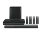 - Dimensions (”): Console – 15.98 W x 2.56 H x 10.16 D | Omni Jewel Side speakers (each) – 1.84 W x 5.77 H x 1.84 D | Omni Jewel Center speaker – 21.34 W x 1.9 H x 1.84 D | Bass module – 11.61 W x 12.8 H x 11.61 D | Wireless receivers – 6.54 W x 1.6 H x 3 D