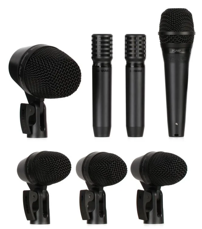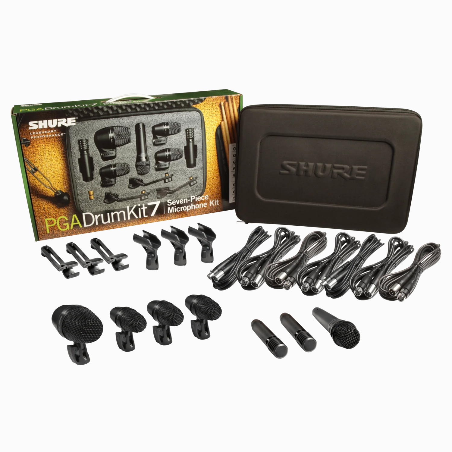 The PGADRUMKIT7 from Shure is a 7-piece professional-quality drum microphone kit designed to capture sound for close-mic kick drum, snare, and tom performance sets. It can be used in audio applications for live stage, theater, houses of worship, and more.